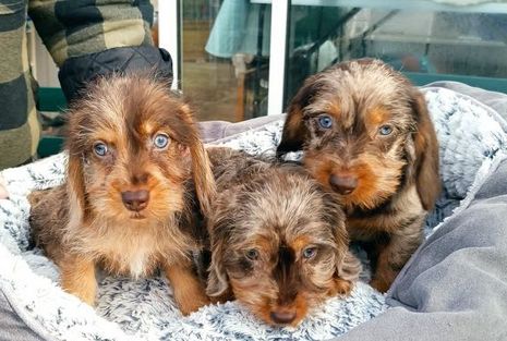 Très beau chiot poil dur arlequin chocolat aux yeux bleus. Sera de taille nain adulte. United Colors est toujours de bonne humeur et très sympathique :) Il partira vivre au Cap D'Ail, parties de chasse et balades en bateau l'attendent :)